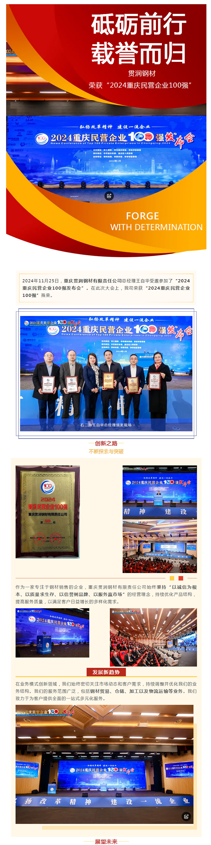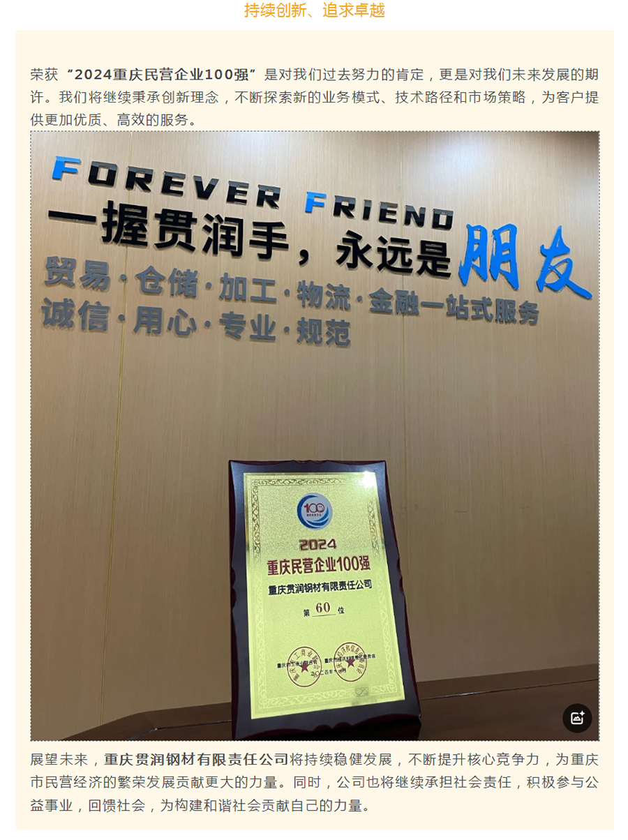 熱烈祝賀重慶貫潤鋼材有限責(zé)任公司榮獲“2024重慶民營企業(yè)100強(qiáng)”